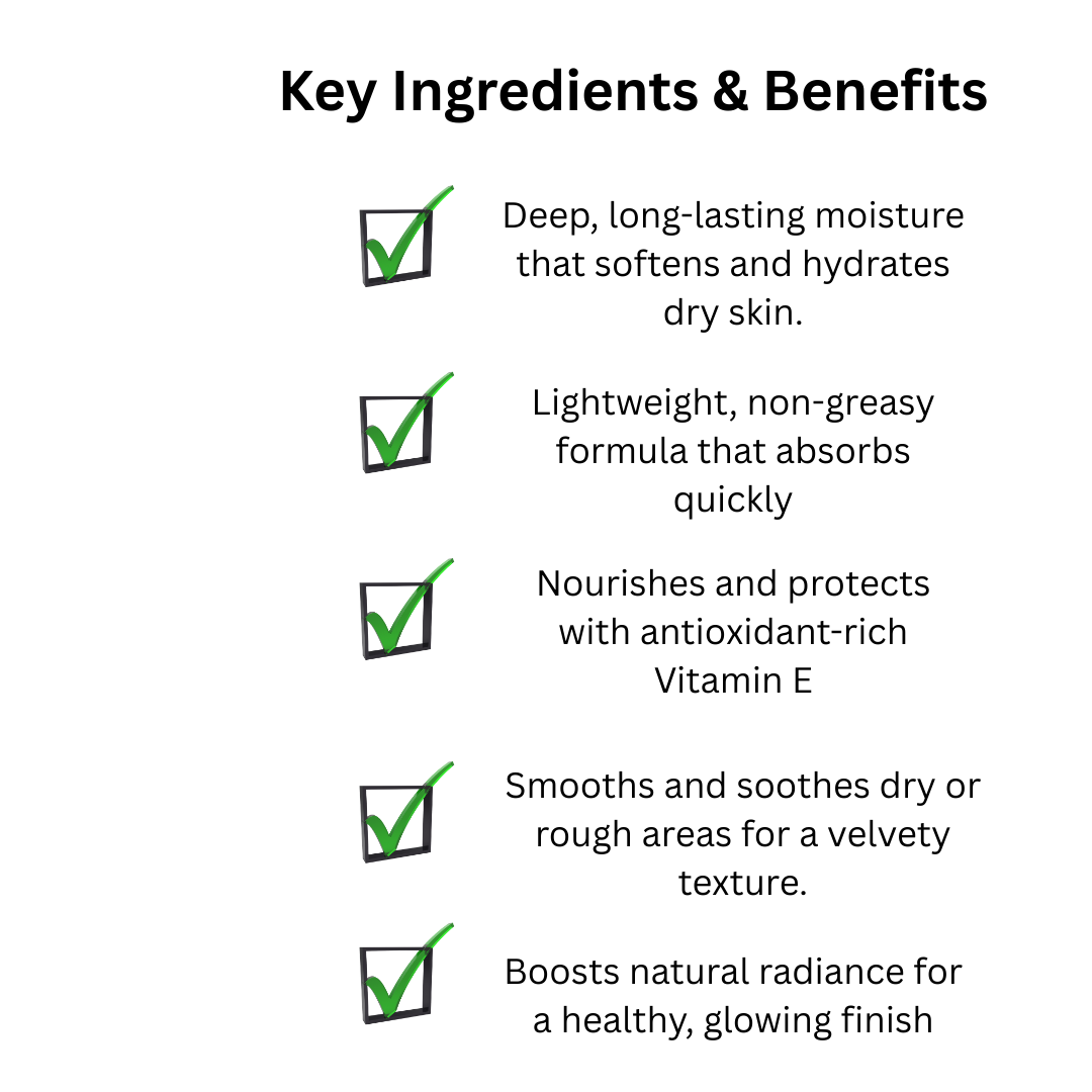 Shea Butter and Cocoa Butter work together to deeply hydrate and soften dry, rough skin.